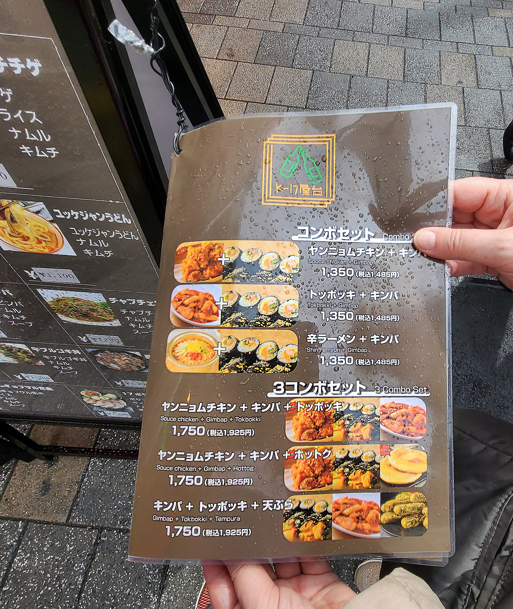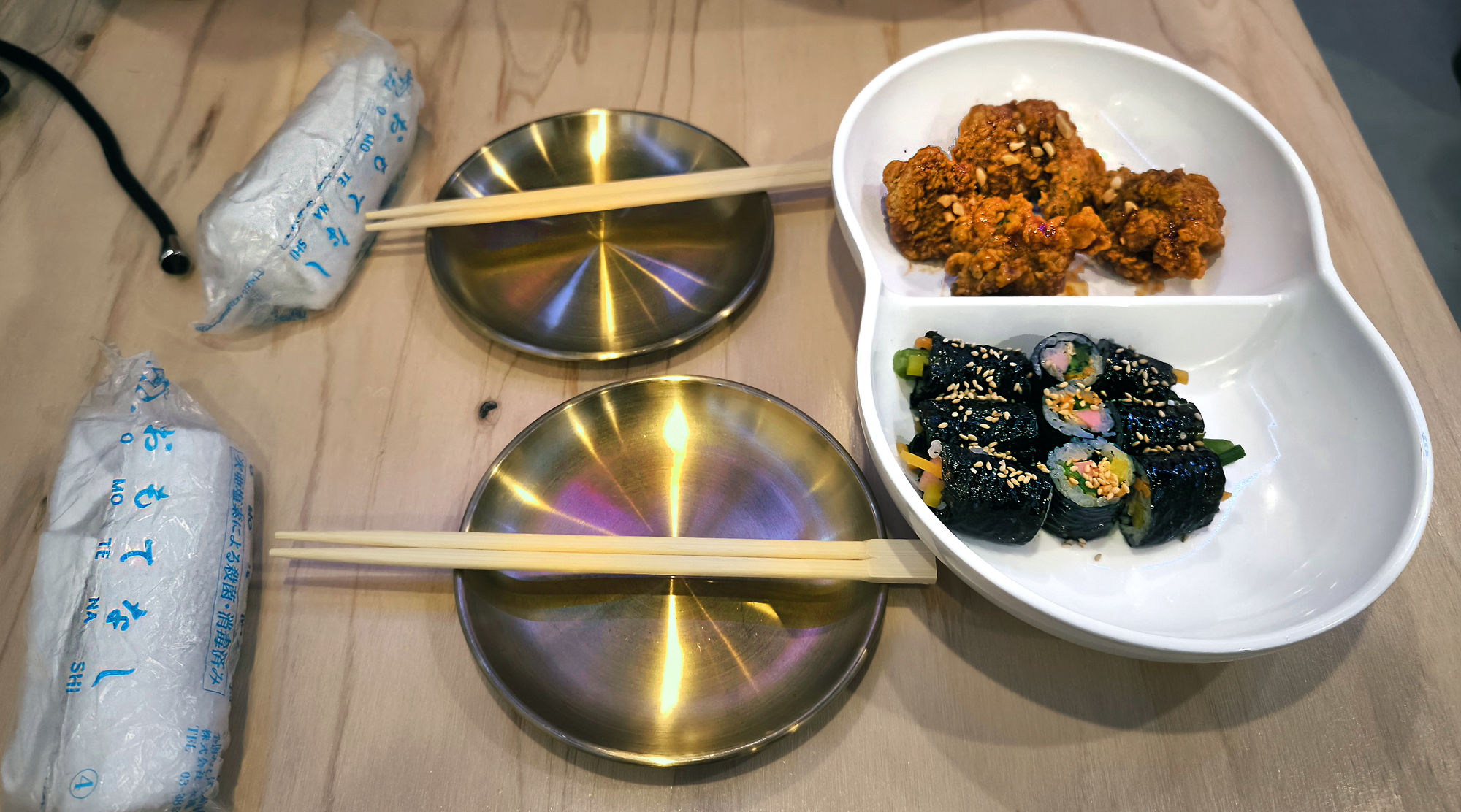 Sono “Souce chicken e Gimbap” (1.485 yen, circa 9€), con le immancabili bacchette di bambù monouso e il mini asciugamano caldo e umido: l’oshibori おしぼり.