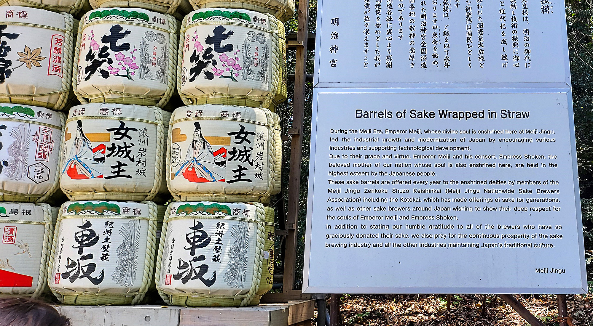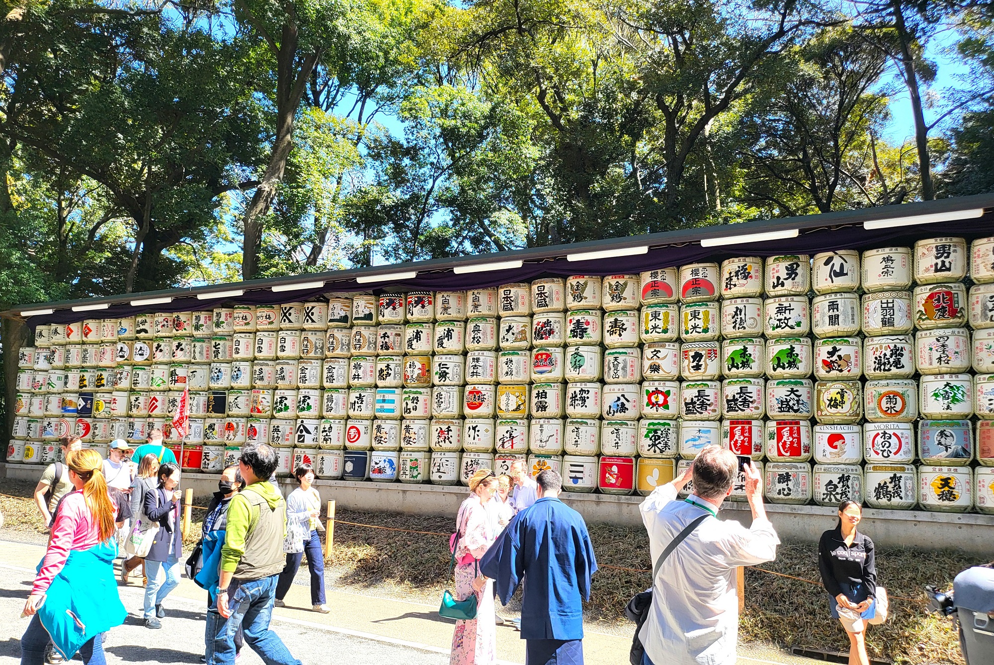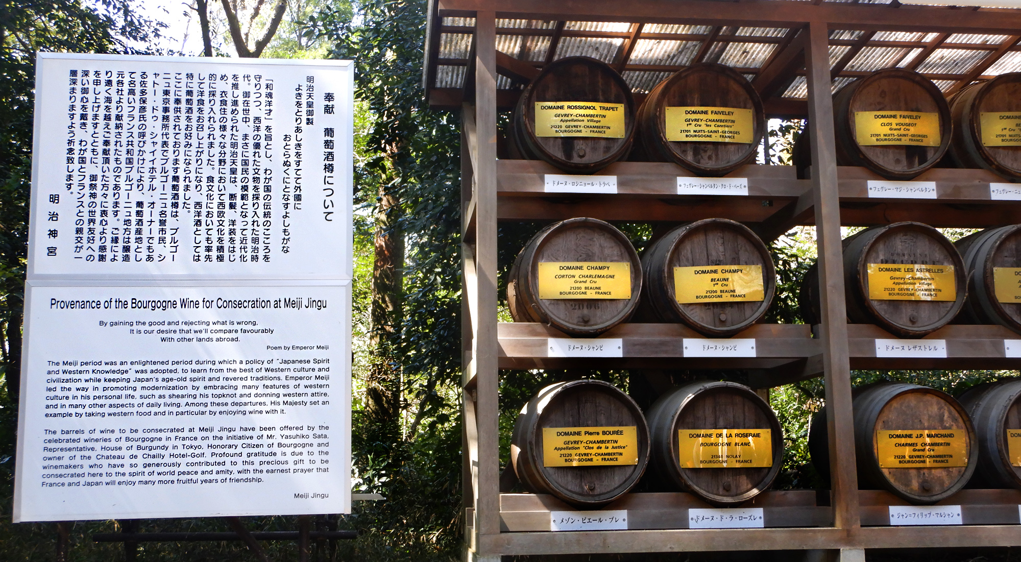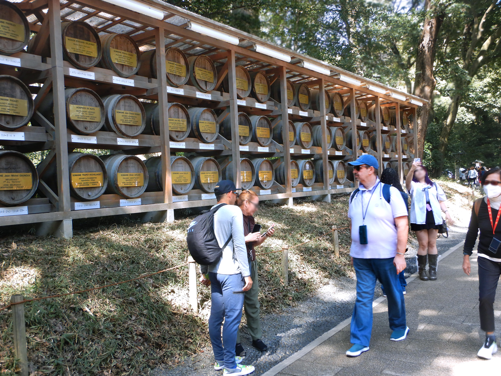 Una lunga parete di botti di sakè, donate al santuario da produttori giapponesi, costeggia il viale. Di fronte, una serie di botti di vino provenienti dalla Borgogna, donate da produttori francesi, gesto di amicizia tra le due nazioni: