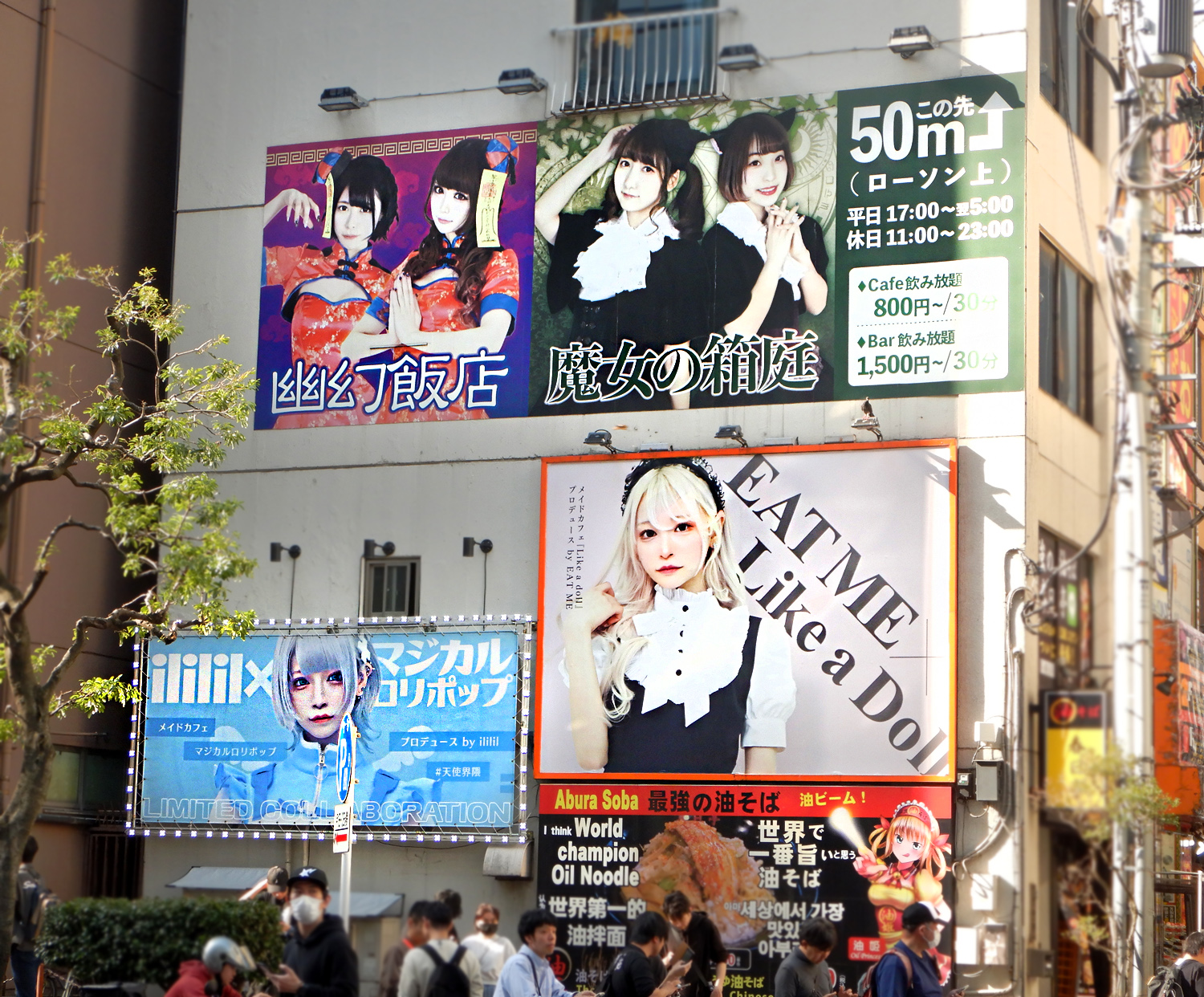 Attività commerciali in stretti ed alti palazzetti, una ad ogni piano: pub e bar, manga e anime, elettronica e riparazioni, maid cafè ma anche ramen, burgher, vino, elettronica e tanto altro.